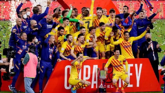 Barcelona beat Athletic Bilbao 4-0 on Saturday at La Cartuja in Seville to win the Copa del Rey and secure their first trophy under coach Ronald Koeman. Lionel Messi scored twice, and Antoine Griezmann and Frenkie de Jong also were on track as Barca won their first piece of silverware since 2019 and lifted the Spanish cup for a record-extending 31st time.